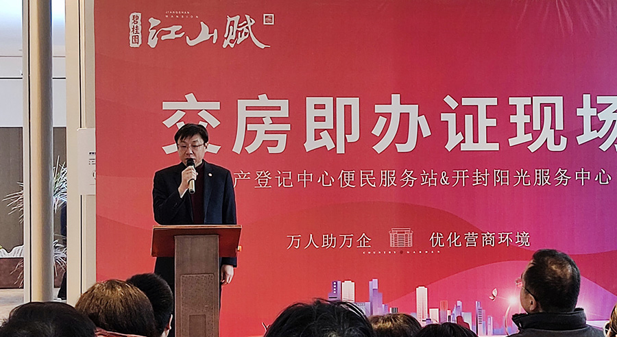 闫凯主任在活动中发表讲话,他表示:“交房即交证”服务是开封市政务服务的一项重要创新,也是不动产登记工作的一次重大突破。这项服务将有效缩短房产交易时间,保障购房者的合法权益,提升市民的获得感和幸福感。